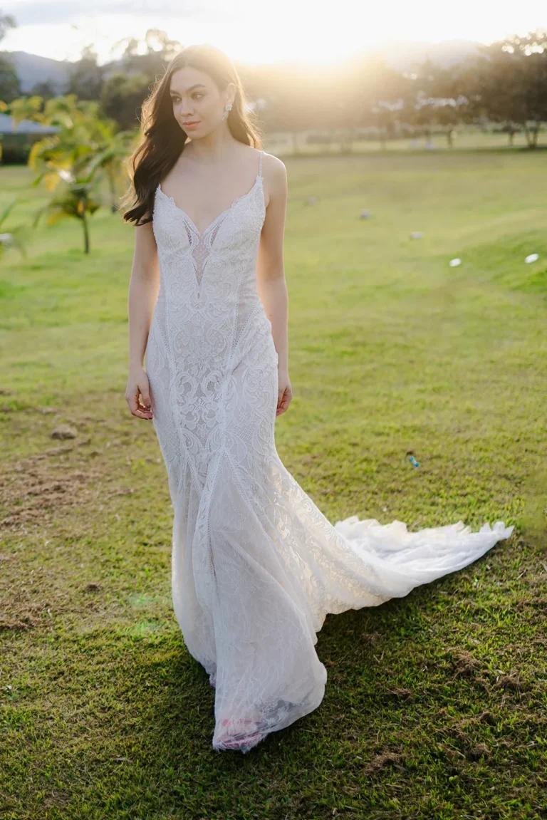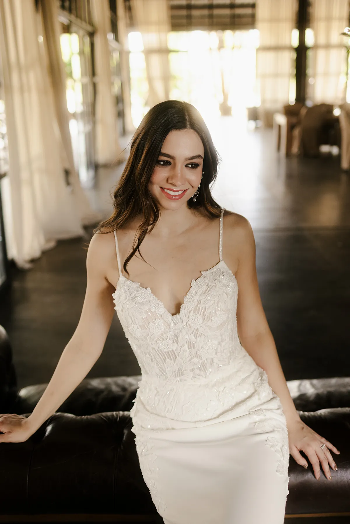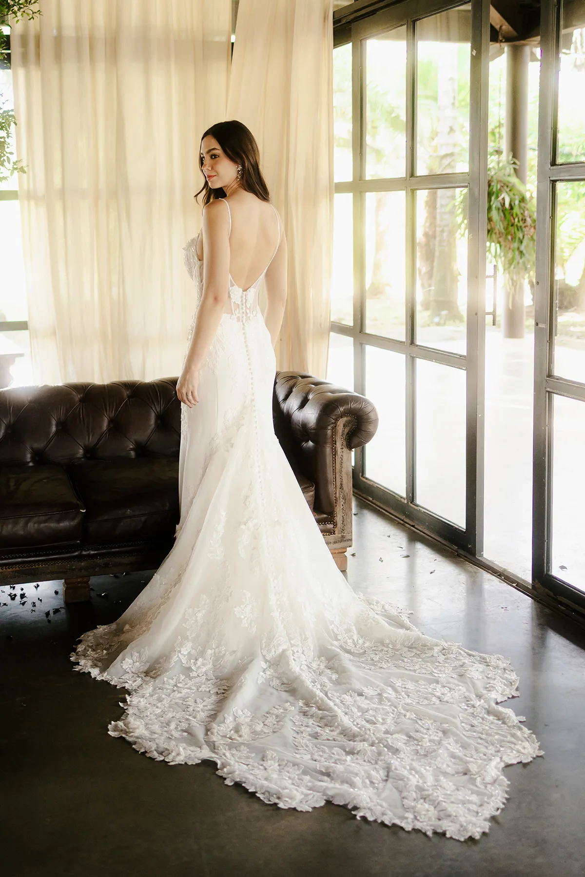 El romance atemporal se fusiona con el glamour chic en Style Blair. El busto, de líneas románticas y escote corazón, resulta sensual y natural, con un look inspirado en un corsé que se extiende hasta la espalda del corpiño. Las elegantes ballenas, enmarcadas con tules ilusión, aportan una estructura sensual, acentuada por botones forrados de tela. Las líneas de lentejuelas en el corpiño añaden un toque ultrachic a este vestido de novia, con capas de encaje floral que le confieren una exquisita dimensión. Apliques de encaje con una hermosa textura envuelven las caderas y se extienden por la falda a los lados para un look romántico. La larga cola de encaje está decorada con apliques de encaje a gran escala hasta el bajo, para un paseo de ensueño hacia el altar.