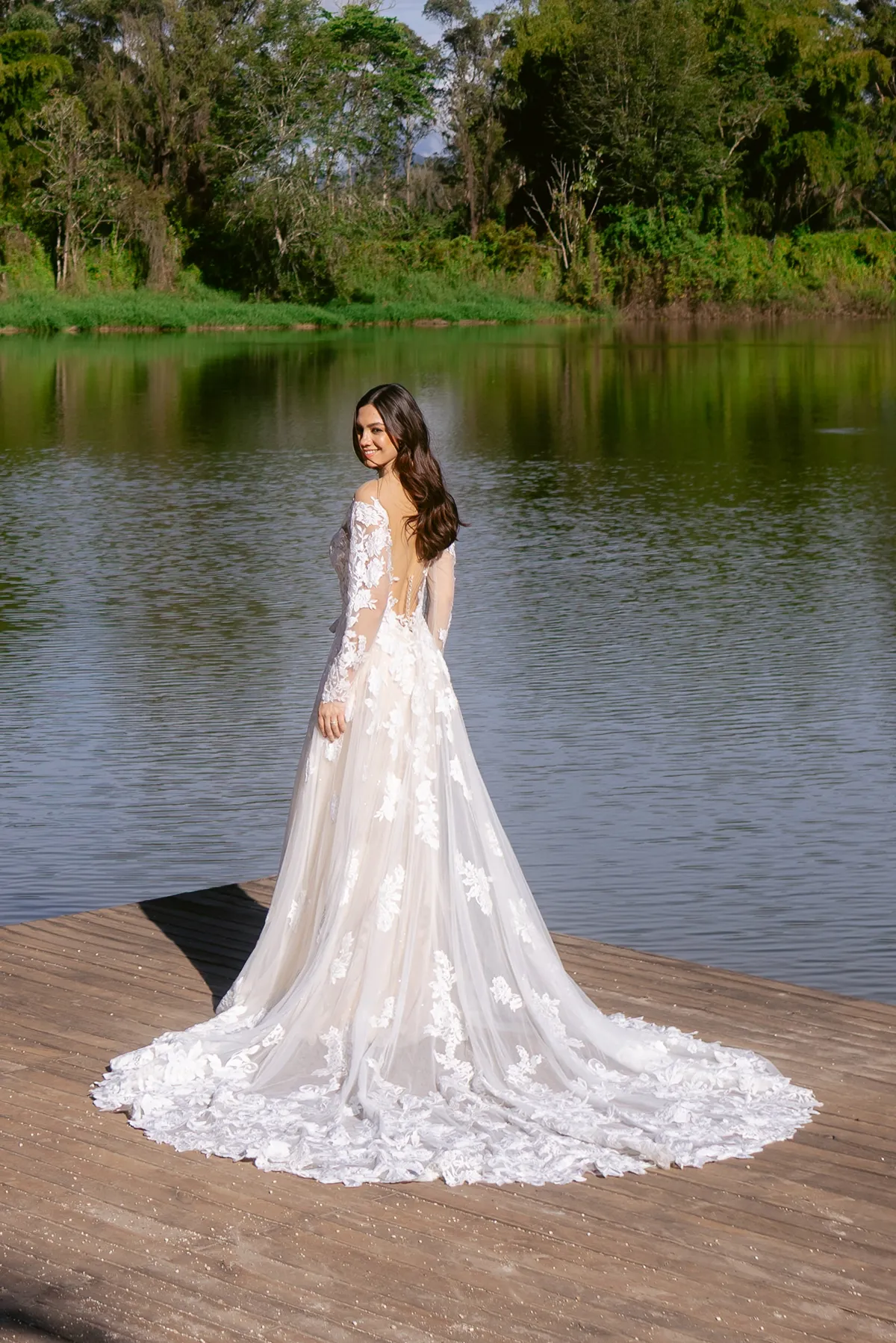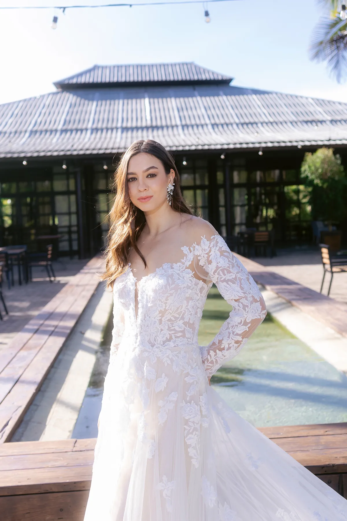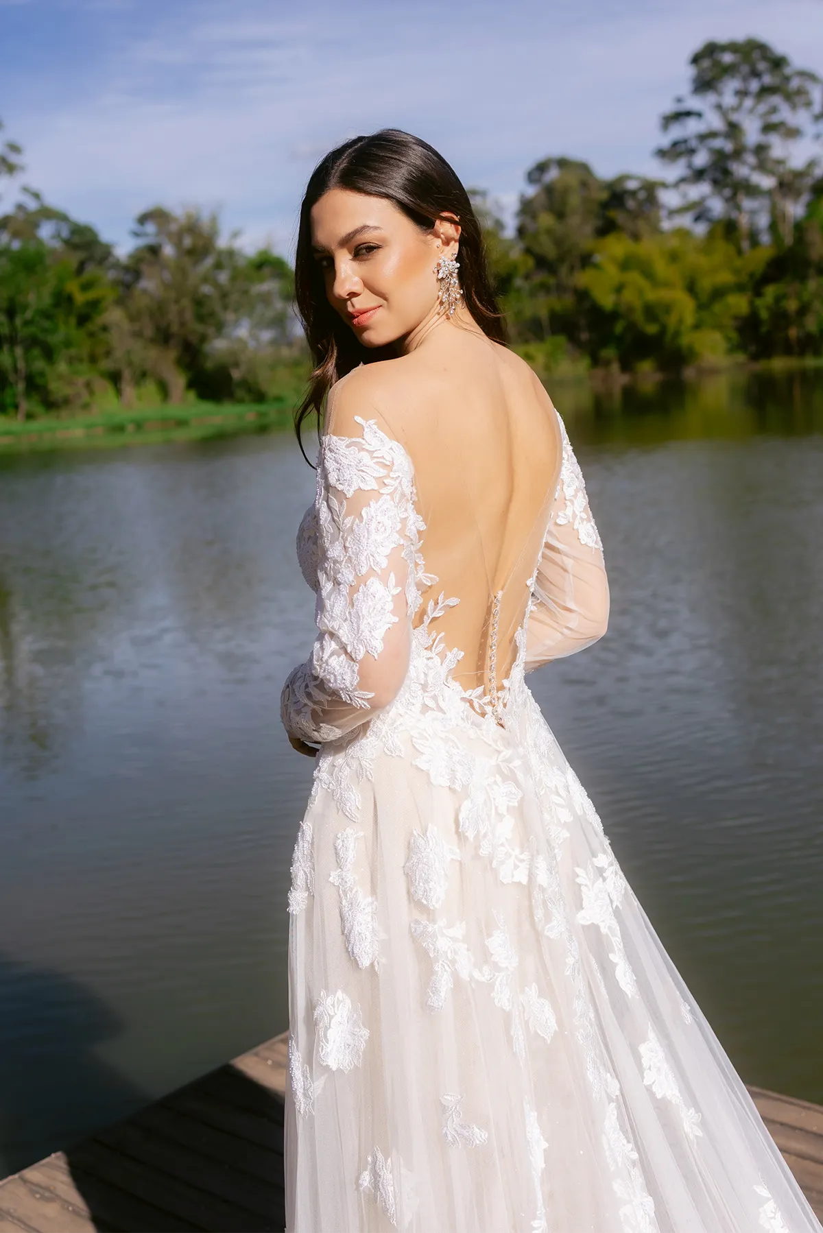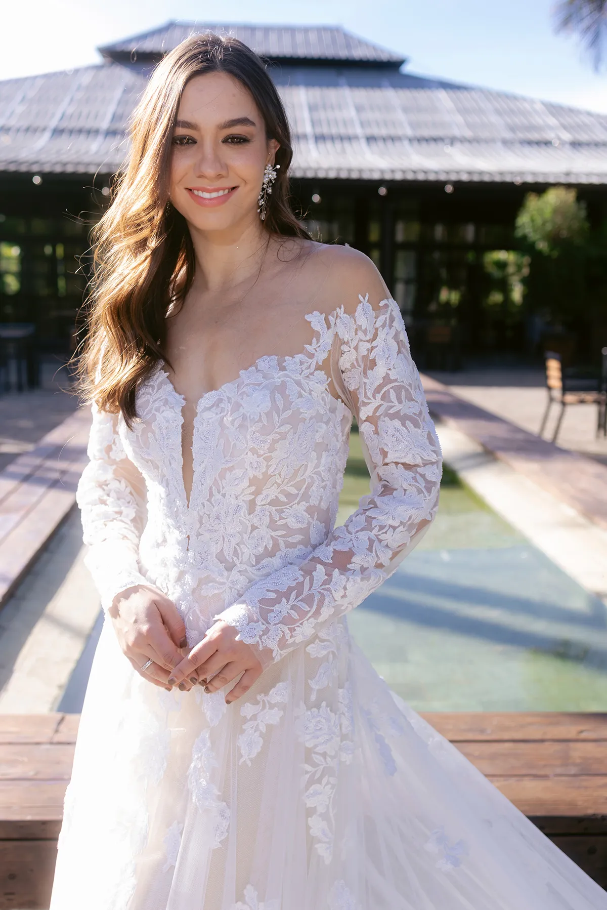 Belleza audaz con un toque moderno, ¡este estilo combina elegancia y atrevimiento! El estilo Harper presenta una gran concentración de encajes florales en el corpiño y mangas largas con hombros ligeramente descubiertos, creando un escote amplio y abierto que realza la parte superior del cuerpo con acabados orgánicos. Los encajes se despliegan con naturalidad al caer sobre la cintura y la lujosa falda de tul brillante, realzando el espacio negativo sobre el fino forro color nude. Los encajes son de un material mate adornado con cristales, creando un contraste impactante. El dobladillo orgánico a lo largo de la cola ornamentada complementa a la perfección la espalda abierta, creando una combinación de belleza moderna y clásica.