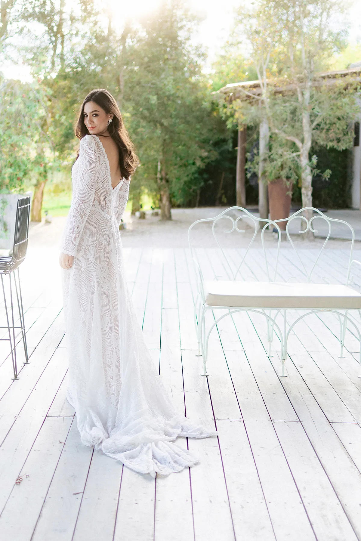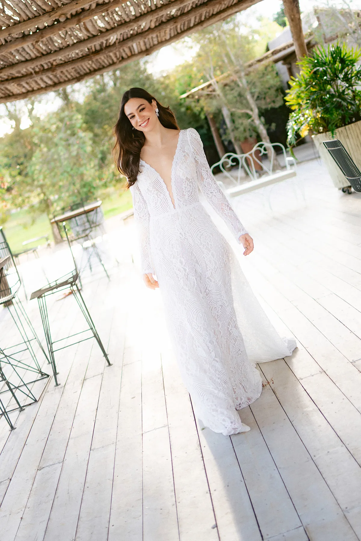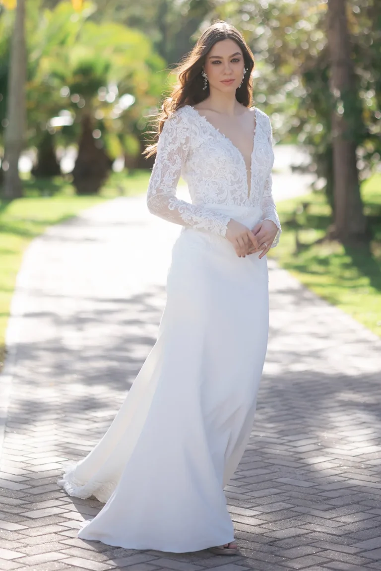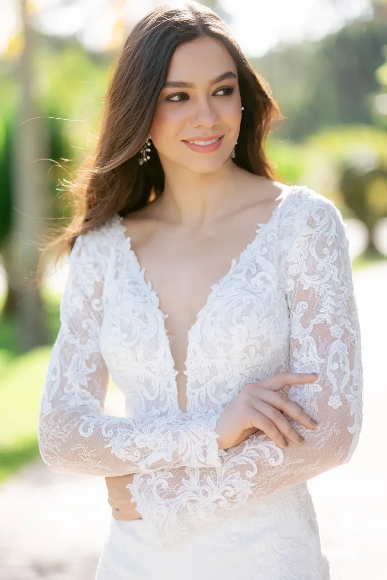 Mangas largas de encaje, diseño de cintura alta, ligero y cómodo. Este hermoso vestido fue hecho para brillar, absolutamente único para tu boda en la playa, al aire libre o donde sueñes.